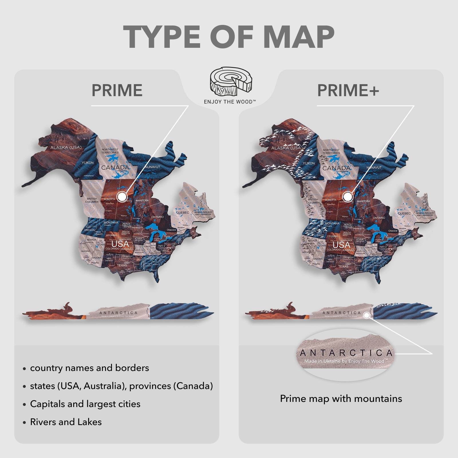 We can offer two options: Prime (LED Map with names, borders, rivers, lakes printed) and Prime+ (LED Map with names, borders, rivers, lakes and mountains printed) and with luminous, covered with non-toxic paints, stores daytime energy, and glows in the dark).