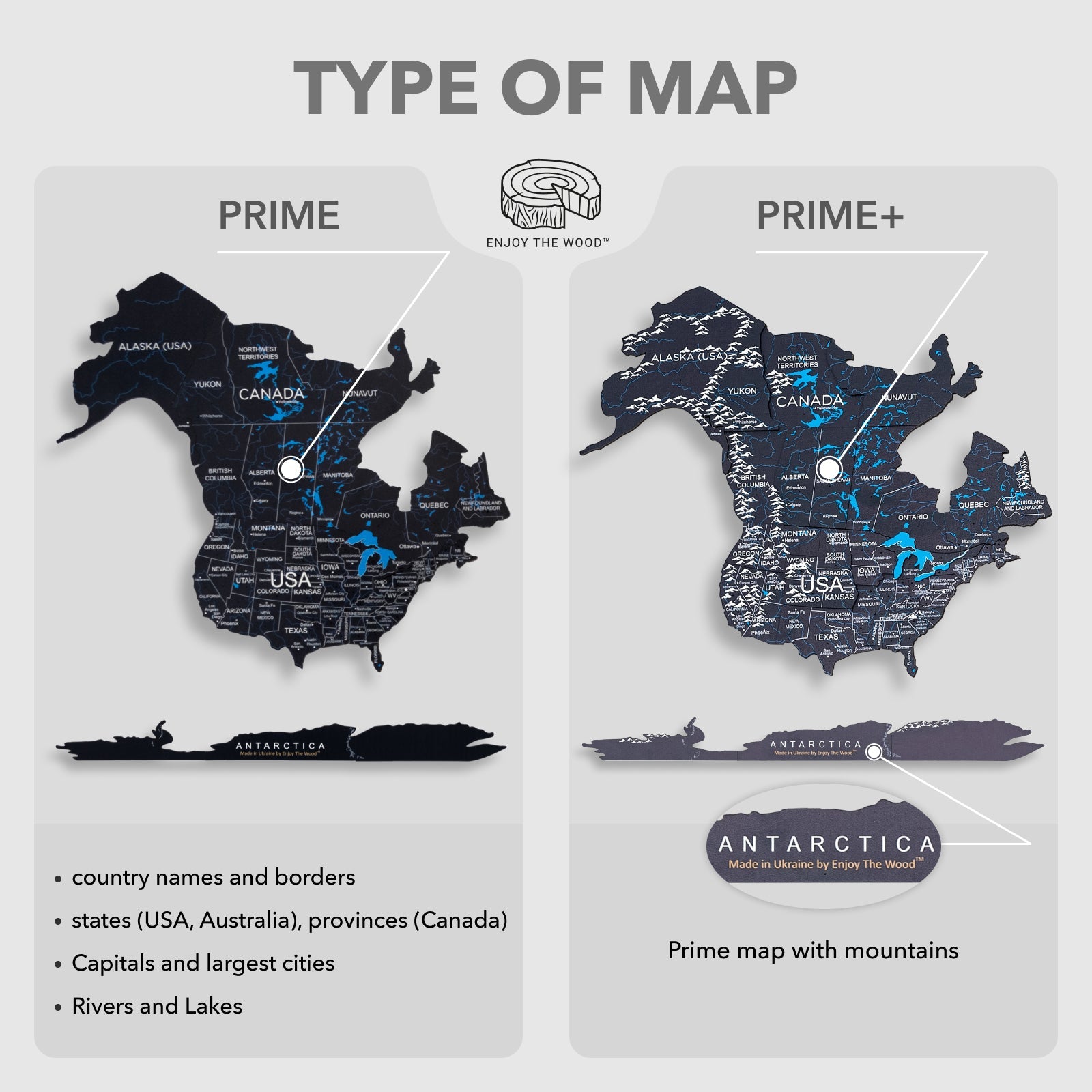 We can offer two options: Prime (LED Map with names, borders, rivers, lakes printed) and Prime+ (LED Map with names, borders, rivers, lakes and mountains printed) and with luminous, covered with non-toxic paints, stores daytime energy, and glows in the dark).