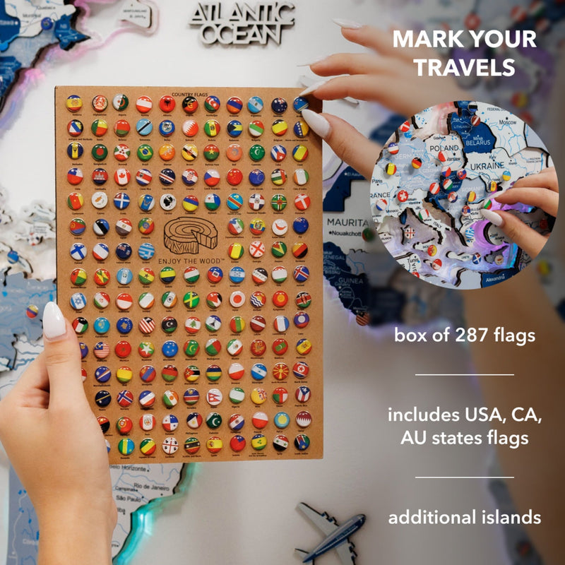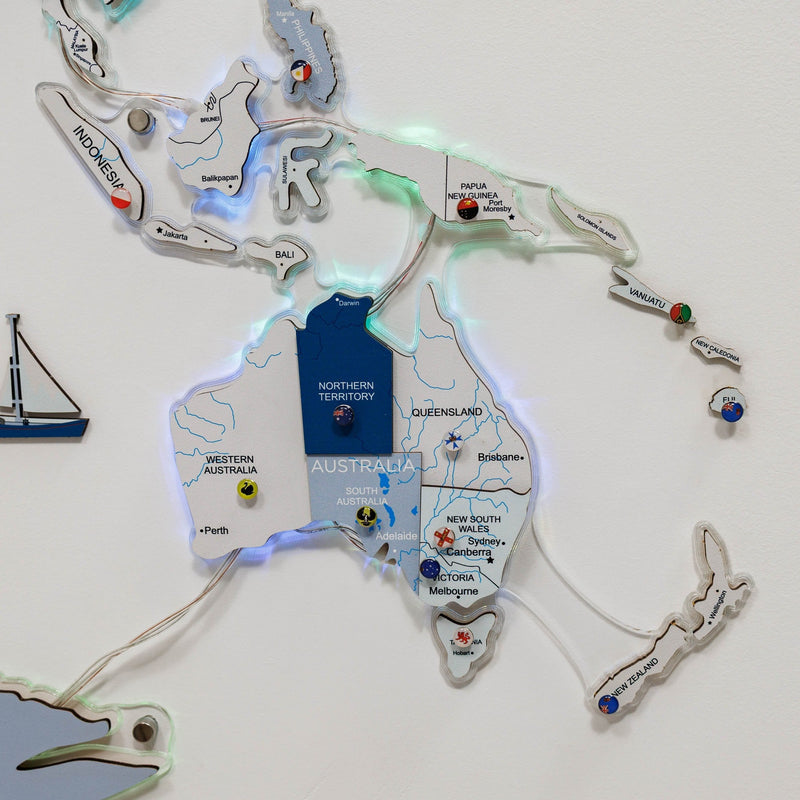 - Acrylic background. The LED 3D world map is ready to be placed on the wall. Some of the smaller islands don’t have the acrylic base and backlight. Just stick them to the wall.