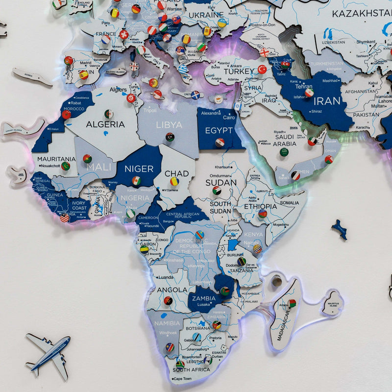 This incredible piece redefines the concept of a world map lighting wall. The map features a multi-layered 3D design, handcrafted from premium wood, giving depth and texture to every continent and country. The centerpiece is the dazzling LED backlighting system, which casts a vibrant Aqua glow around the continents, visible even in the dark.