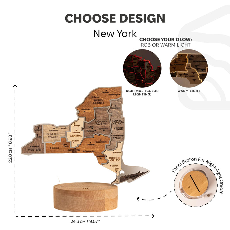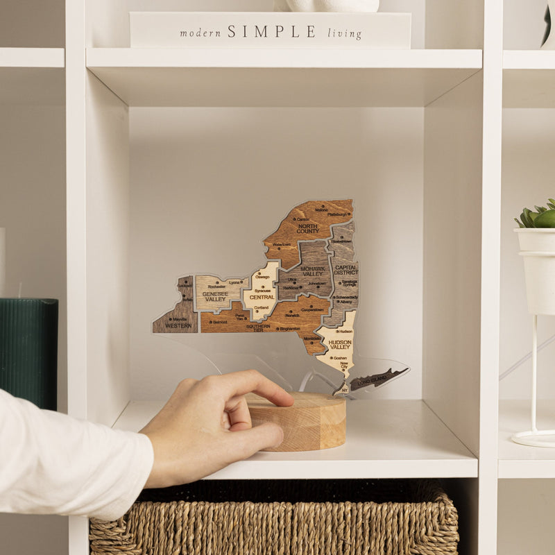 This striking piece is part of our collection of night light lamps for adults, designed to offer continuous, reliable illumination. The New York night light stands on a sturdy alder wood base. The light module features clear acrylic combined with an engraved plywood map, ensuring the light beautifully highlights the state’s detailed geography. The map is detailed with engravings of key cities and regions.
