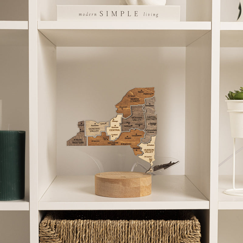 Shine a light on the Empire State with the iconic Night Light - Map of New York State. This elegant piece captures the unique shape of New York, providing both a sophisticated piece of décor and a functional, steady light source. It’s an exceptional way to commemorate the city, the Finger Lakes, or Upstate heritage.