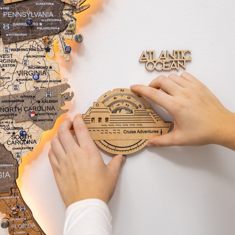 Turn your adventures into lasting memories with the Travel Tracker Cruise Liner 3D Colored Wooden World Map – Gold. This handcrafted piece of art serves as both a visual centerpiece and a practical world travel tracker map. Made from high-quality wood and intricately laser-cut, it displays countries, borders, and continents in a stunning 3D design, inviting you to relive your past travels and plan future journeys.