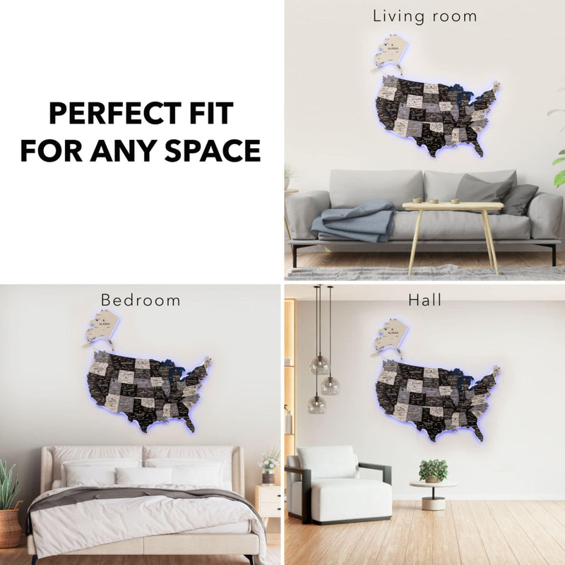 Each map is expertly crafted from high-quality, eco-friendly wood, featuring intricate, laser-cut details that beautifully showcase the contours of the United States. The cool-toned Nordik finish adds a subtle, calming aesthetic, while integrated LEDs offer gentle, customizable illumination for a cozy atmosphere day or night. The included remote control lets you adjust the lighting to suit your mood or occasion with ease.