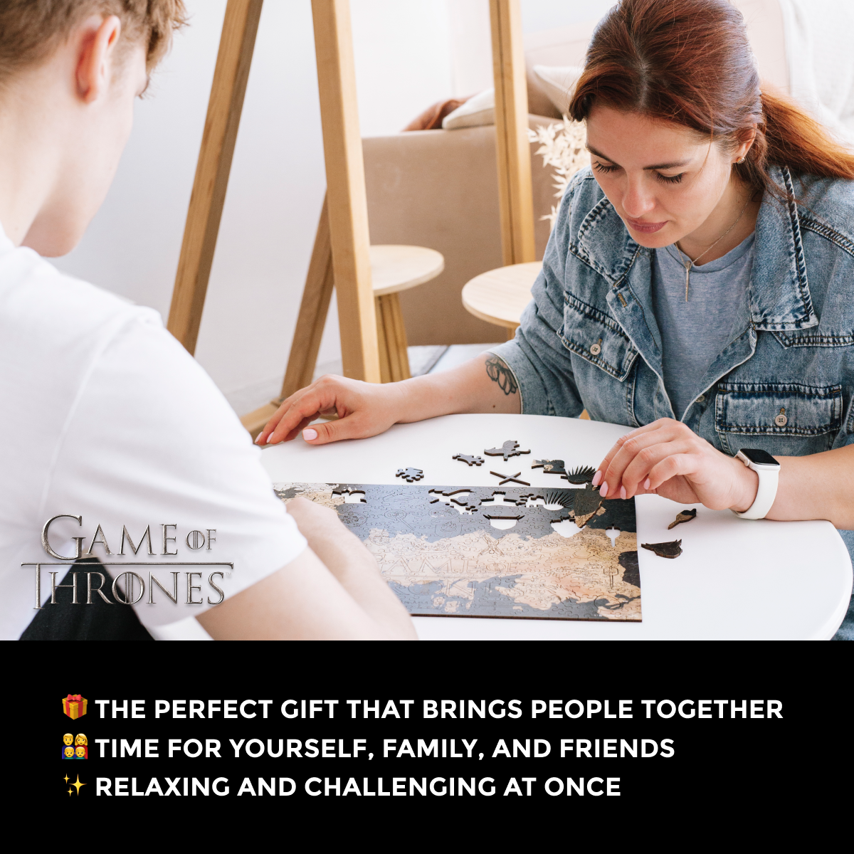 Step into the epic world of Game of Throne™s with this beautifully crafted wooden jigsaw puzzle. Featuring the detailed map of Westeros™ and Essos™, this premium puzzle is an absolute must-have for fans of the legendary series.