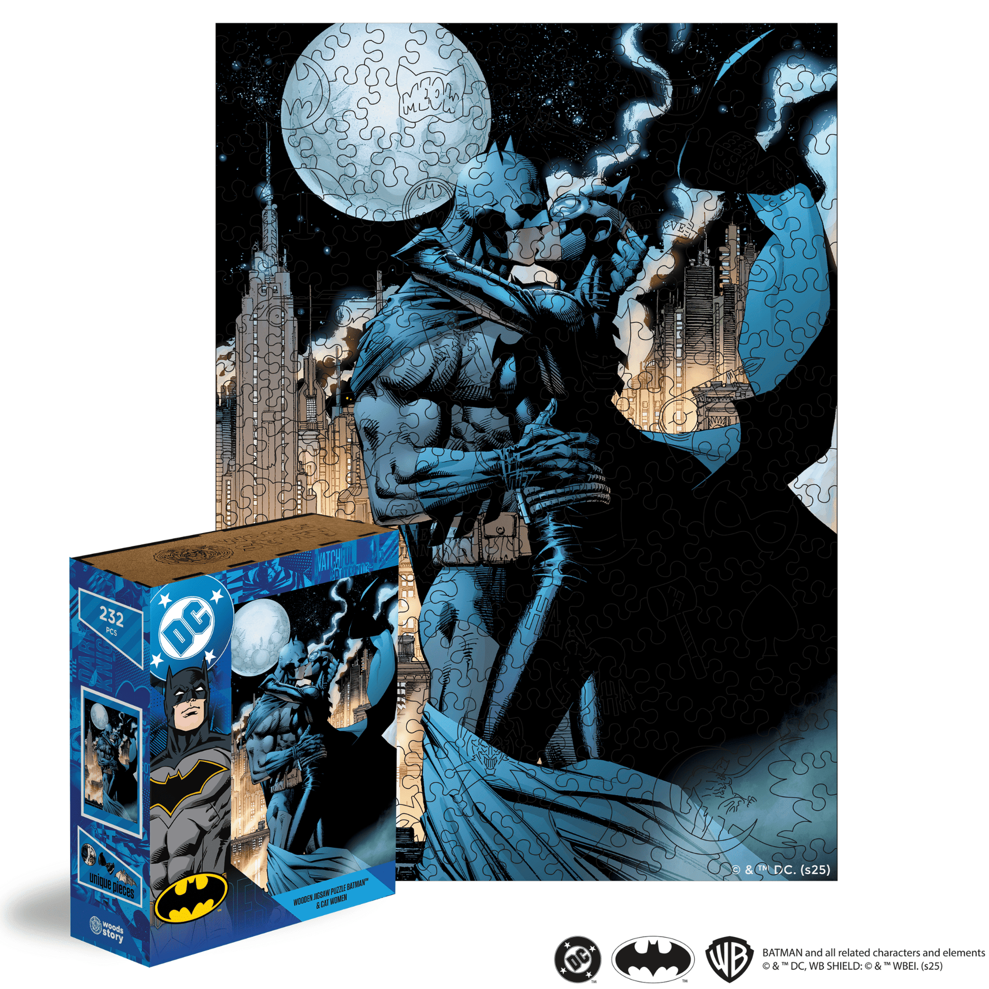 Immerse yourself in the romantic shadows of Gotham with the "Kiss Under the Moon" XL Wooden Jigsaw Puzzle by Woods Story. This intricately designed puzzle captures a tender moment between Batman™ and Catwoman™ beneath the moonlit sky, surrounded by the iconic skyline of Gotham City.