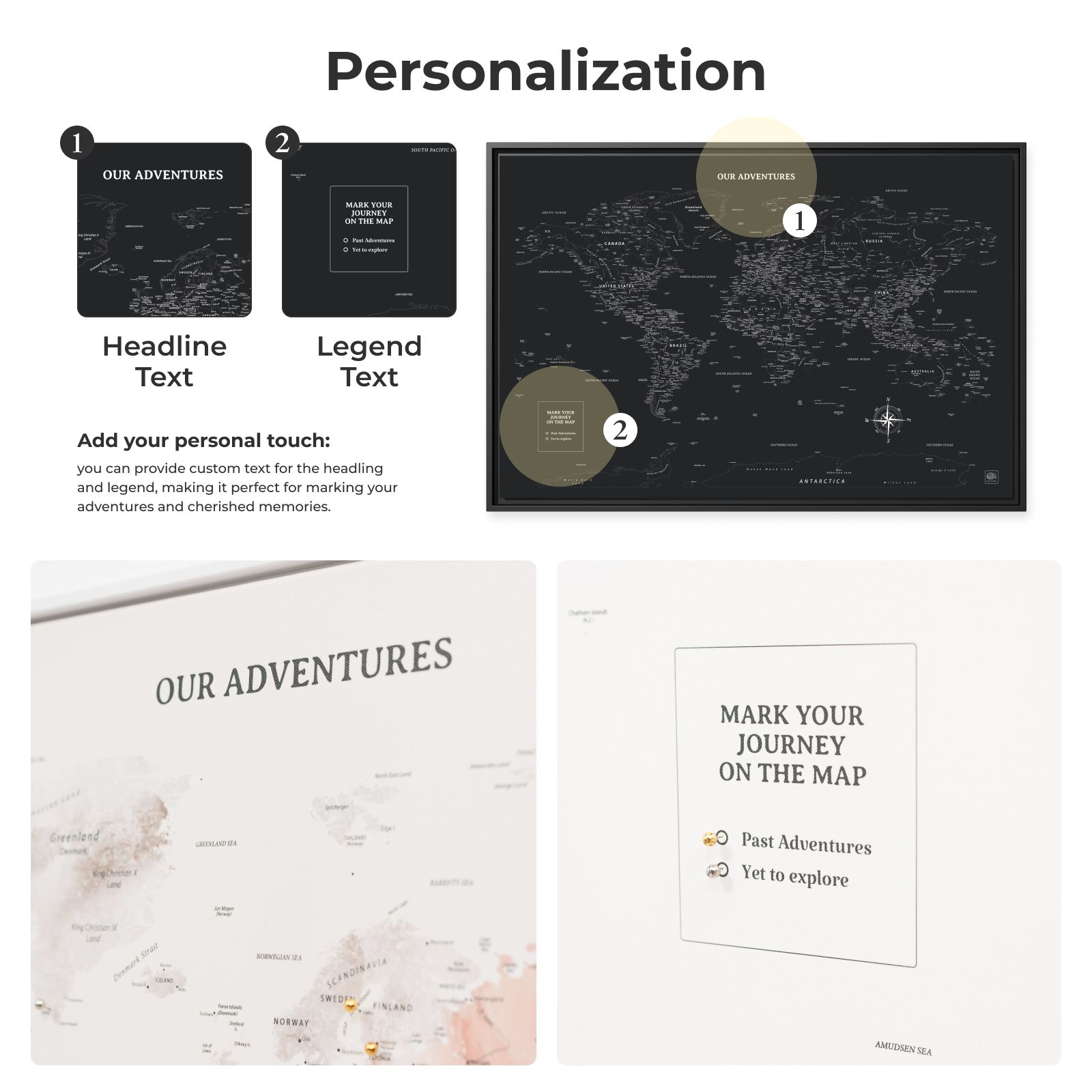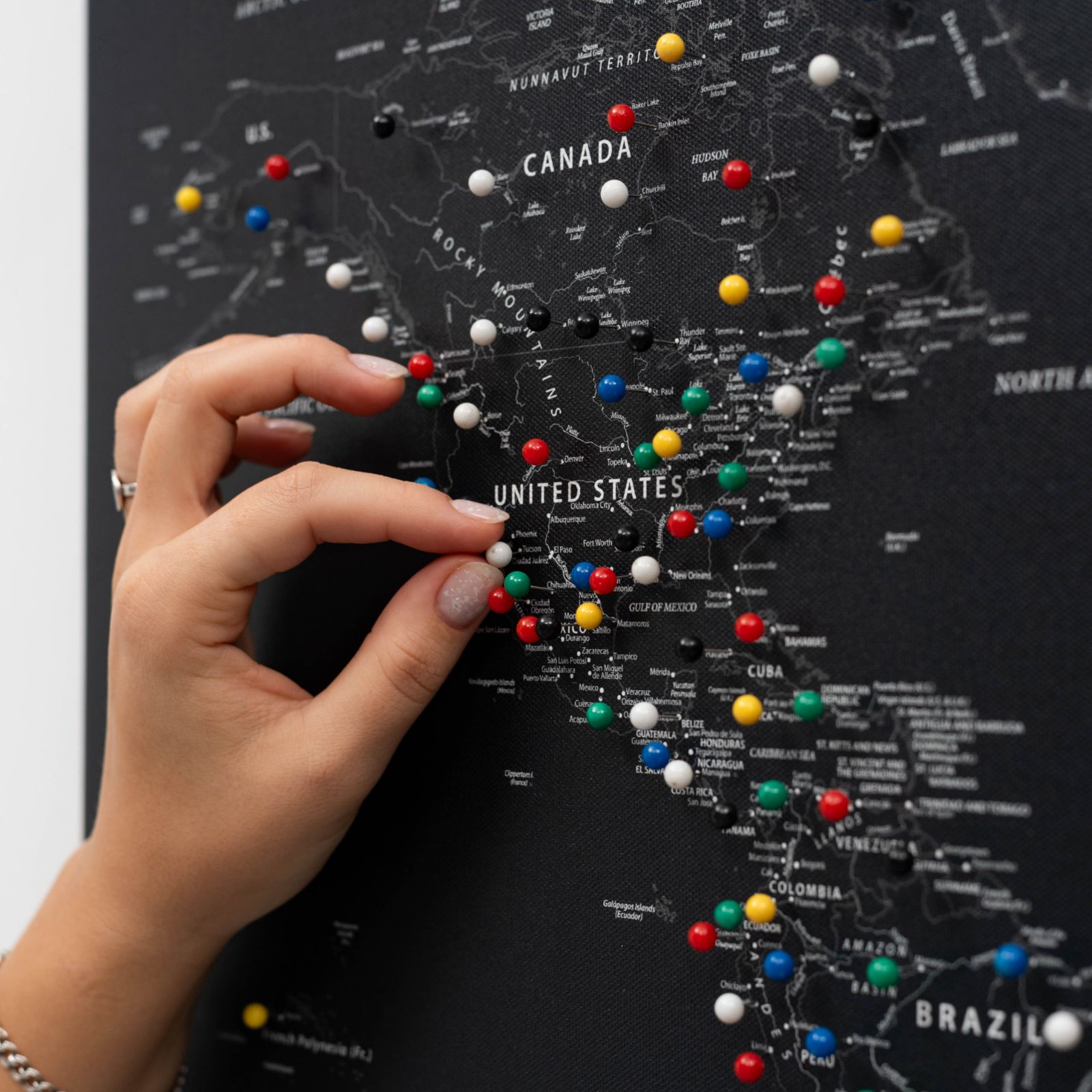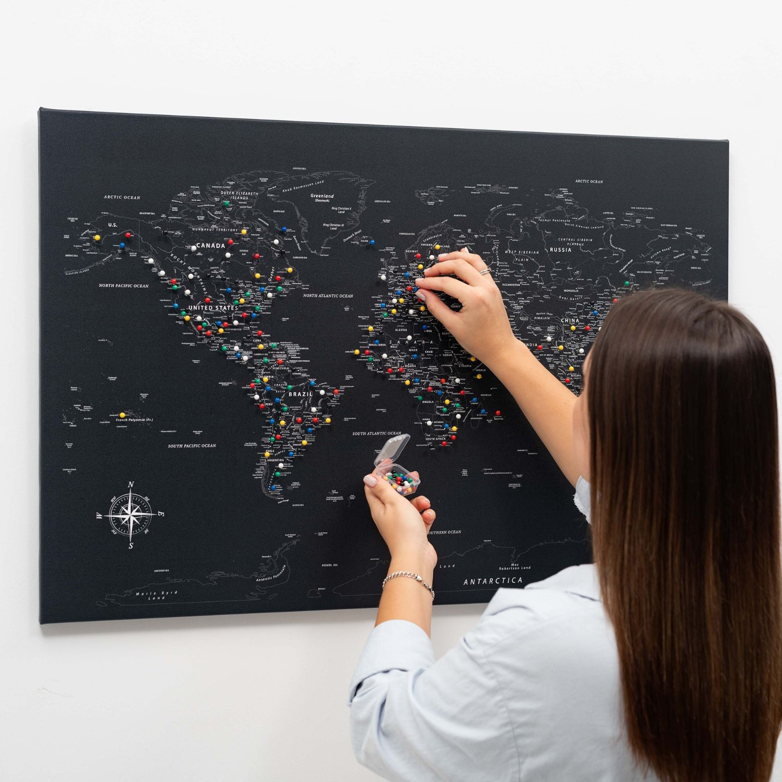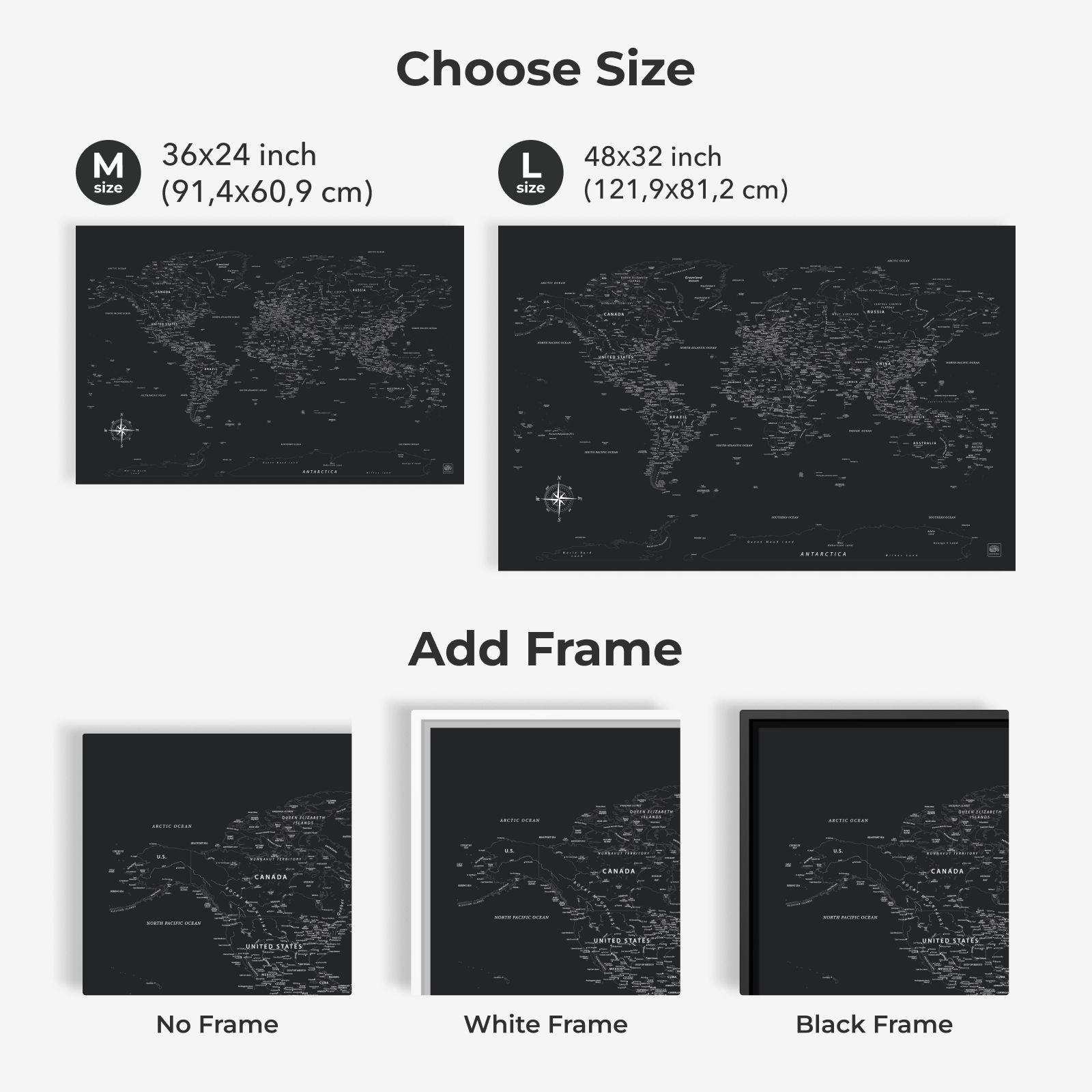 Enhance your space with the timeless elegance of our black world map canvas, a perfect combination of functionality and sophisticated design. This wall art world map canvas not only serves as an eye-catching décor piece but also allows you to document your travels, plan future adventures, or simply admire the beauty of geography.