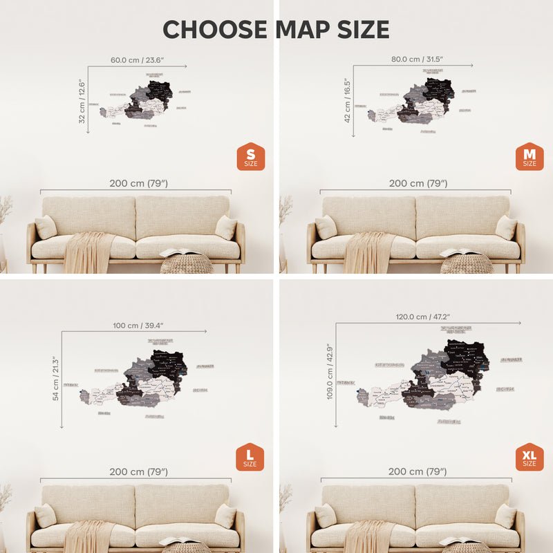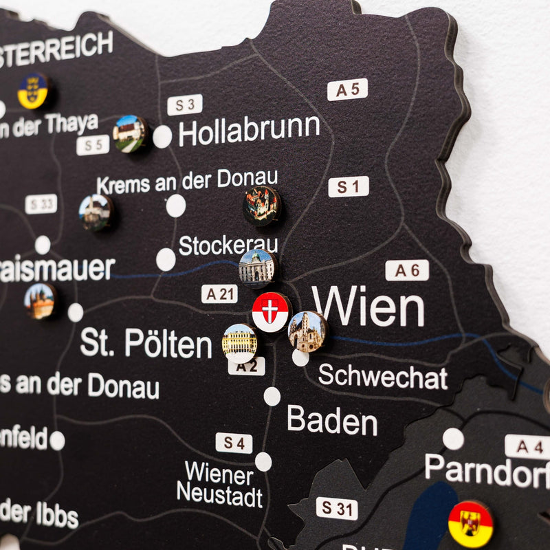 Ви маєте можливість перетворити своє настінне мистецтво на особистий щоденник подорожей, додавши власні набори значків. Ви можете вибрати набір «Визначні місця Австрії», щоб виділити 30 відомих місць по всій країні, або набір «Федеральні землі Австрії», щоб відобразити унікальні прапори 9 федеральних земель. Ці значки можна легко прикріпити до дерев'яної поверхні, зробивши вашу карту динамічною та мінливою частиною вашого дому.