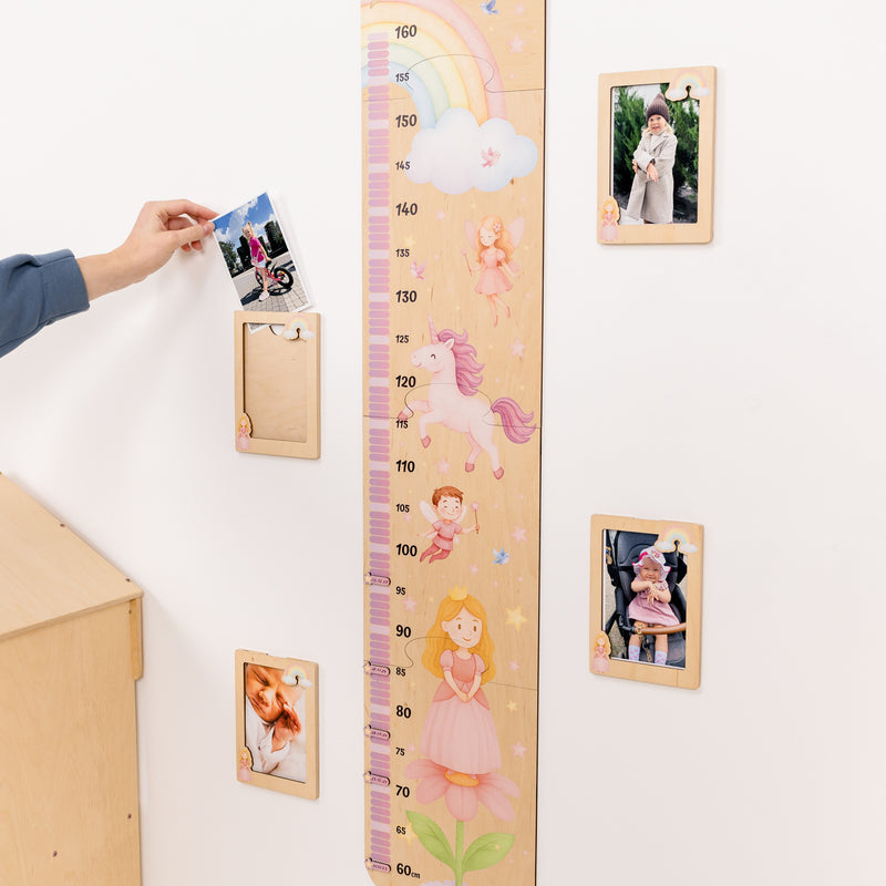 Ця чудова таблиця зросту для дівчаток виготовлена з міцної високоякісної деревини, що гарантує, що вона стане цінною сімейною реліквією. Яскраво-рожеві та м'які пастельні тони ілюстрації роблять її ідеальним центральним елементом кімнати будь-якої маленької дівчинки чи дитячої. Фантастичні образи надихають на творчість і перетворюють часто буденне завдання вимірювання зросту на захопливу частину дня.