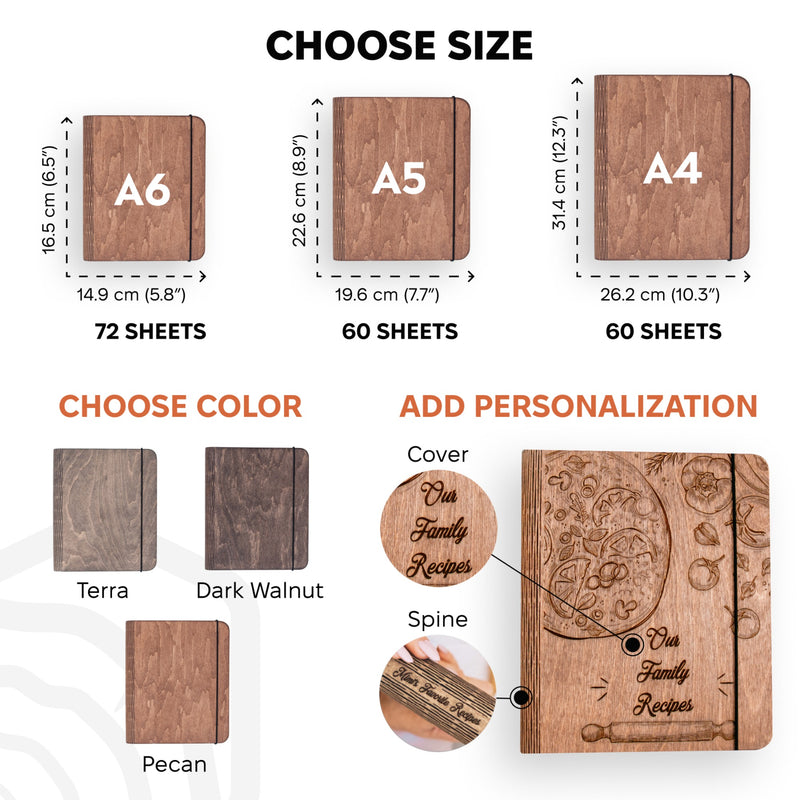 Представляємо дерев'яну книгу рецептів – рецепти піци від Насолоджуйтесь лісом ! Цей блокнот з рецептами, виготовлений у цікавому стилі піци, ідеально підходить для документування всіх ваших улюблених страв з піци. Оберіть ідеальний розмір — A6, A5 або A4 — та оберіть один із трьох унікальних шаблонів рецептів всередині. Персоналізуйте обкладинку будь-яким власним текстом, наприклад, «Книга рецептів Емілі» або «Наші сімейні рецепти», що зробить її справді особливою.